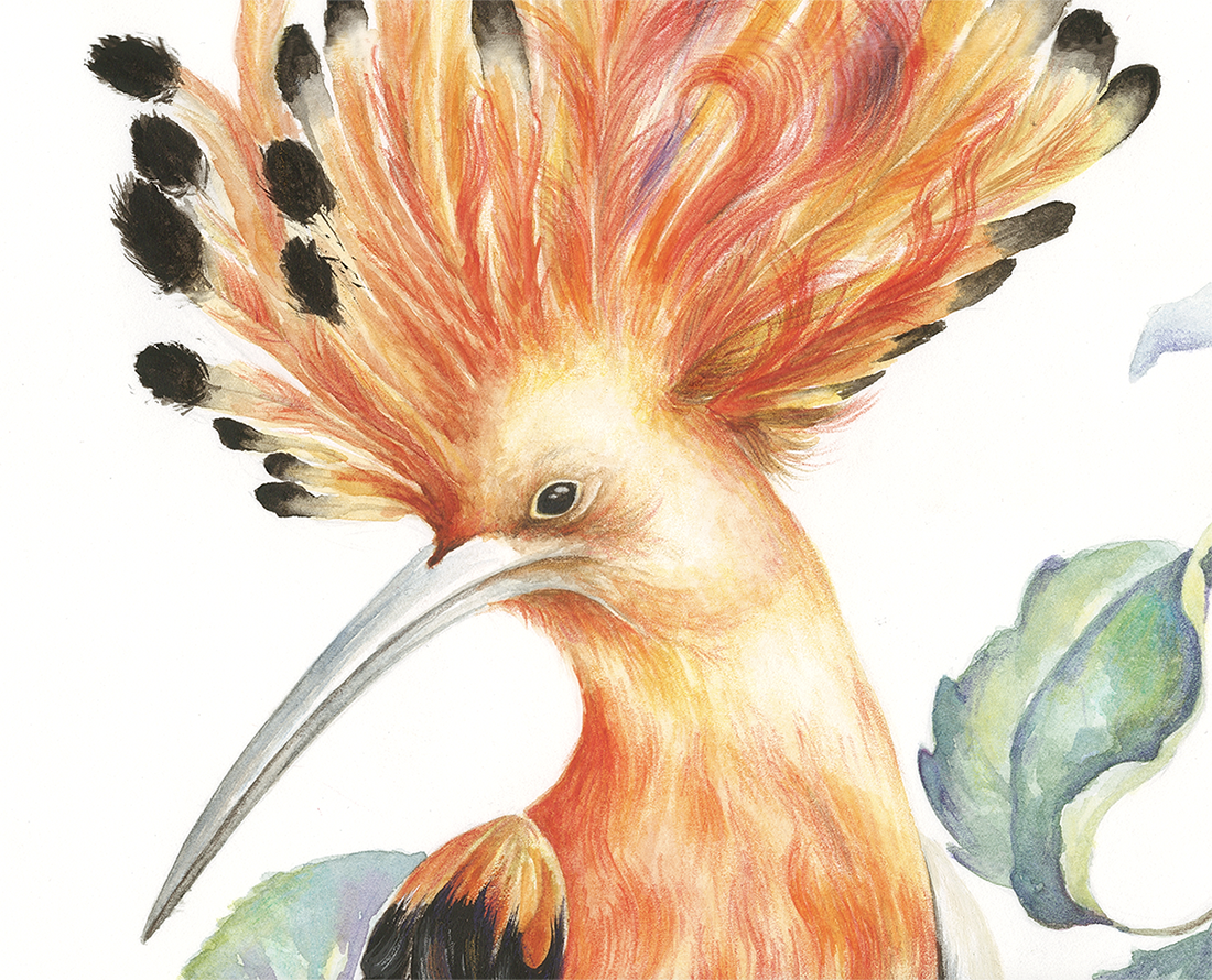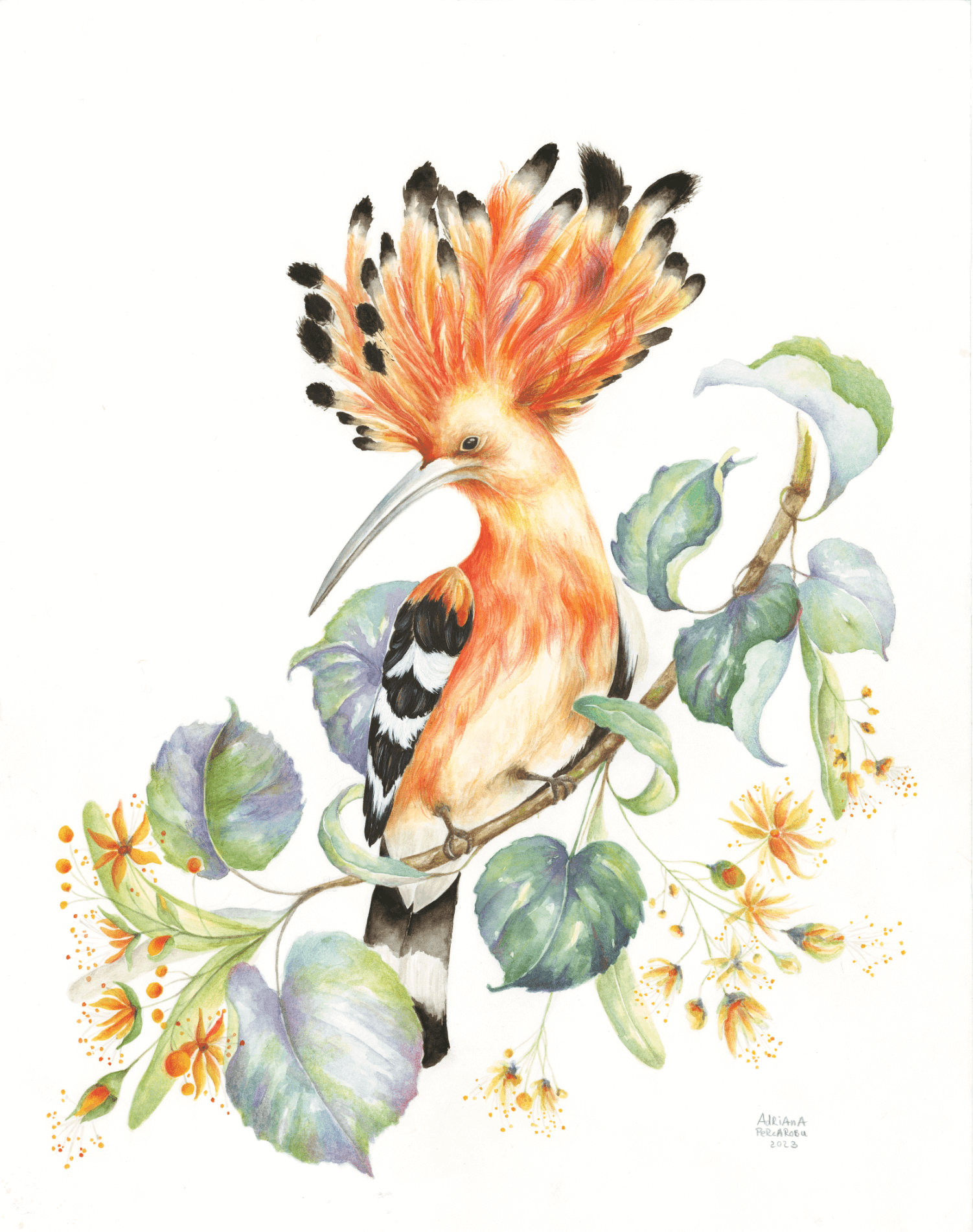 Tehnică mixtă: acuarelă și creioane colorate – combinație care oferă finețe detaliilor și profunzime cromatică.